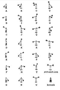 This ongoing performance project is constructed around the communication technique of flag semaphore which was widely used in the maritime world in the 19th century. Each letter of the alphabet is represented by the position of two hand-held flags.