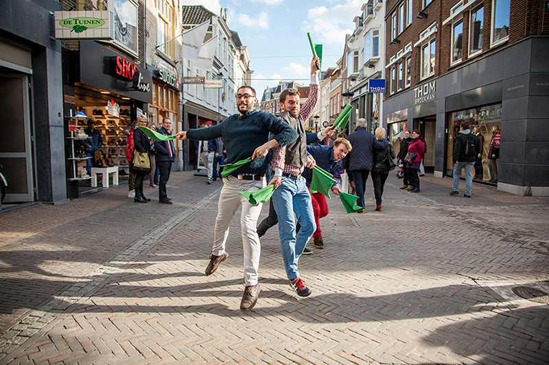 Visually strong, energetic interventions with flags surprise by-passers in public spaces. The performers appear among the pedestrians, in changing formations and with different dynamics they signal short FMS messages and collectively execute choreographic practices in relation to these signals. The messages articulate short and partially provocative statements on contemporary modes of human behaviour in public spaces. Watch the short film to get an impression of these Guerrilla dance activities.